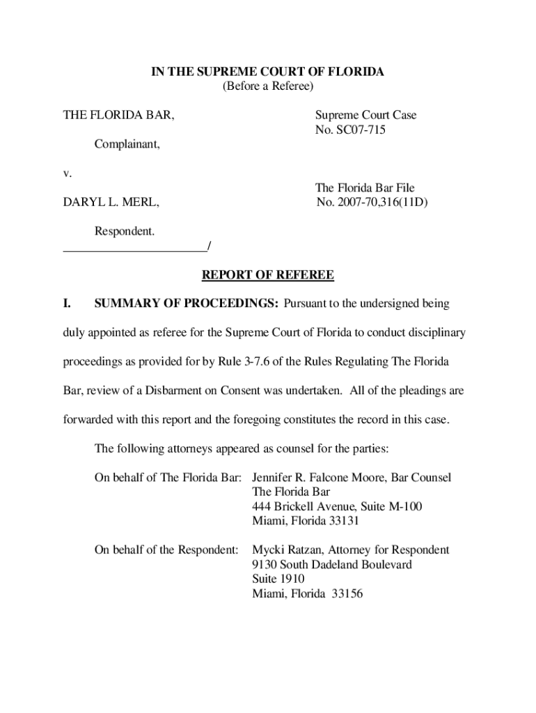 IN THE SUPREME COURT OF FLORIDA (Before a Referee) THE FLORIDA BAR, Supreme Court Case No. SC07715Complainant, v. The Florida Bar File No. 200770,316(11D)DARYL L. MEAL, Respondent. /REPORT OF REFEREE