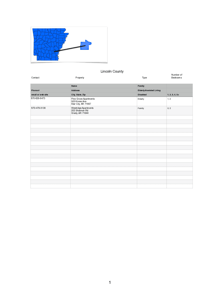 Lincoln County ContacPropertNumber o BedroomsTypNameFamilyPhone #AddressElderly/Assisted Living email or web SimCity, State, ZipDisabled1, 2, 3, 4, 5+8706286473Pine Grove Apartments 500 Knows Ave
