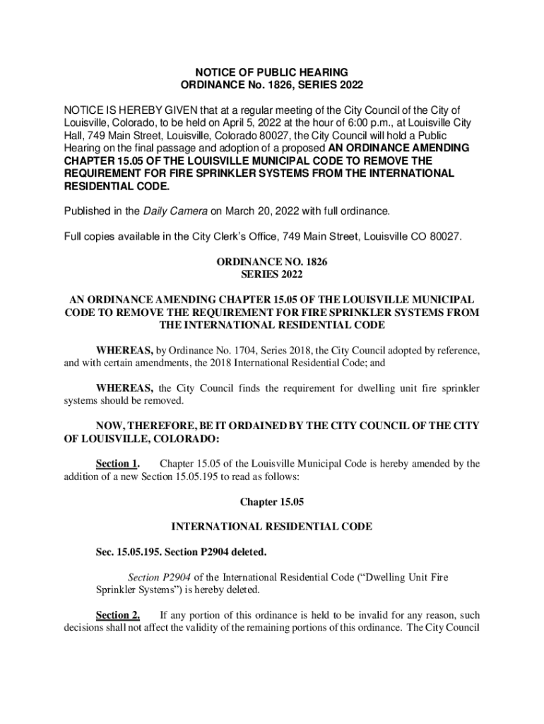 NOTICE OF PUBLIC HEARING ORDINANCE No. 1826, SERIES 2022 NOTICE IS HEREBY GIVEN that at a regular meeting of the City Council of the City of Louisville, Colorado, to be held on April 5, 2023, at the