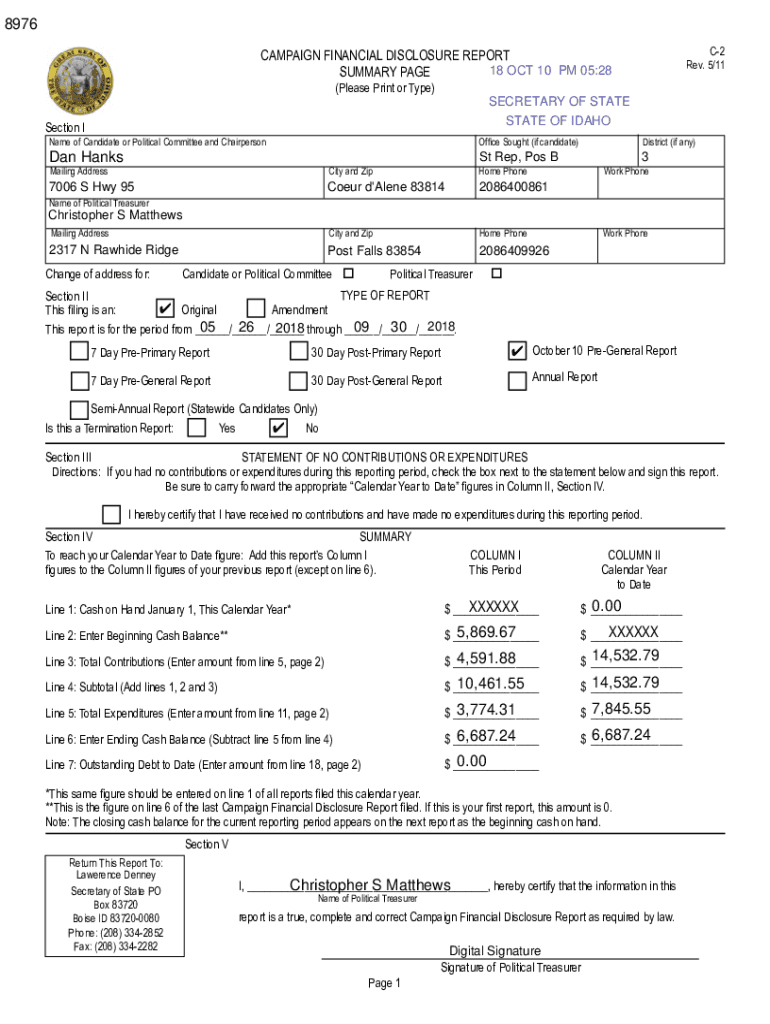 8976 C2 Rev. 5/11CAMPAIGN FINANCIAL DISCLOSURE REPORT 18 OCT 10 PM 05:28 SUMMARY PAGE (Please Print or Type) SECRETARY OF STATE OF IDAHOSection I Name of Candidate or Political Committee and ChairpersonOffice