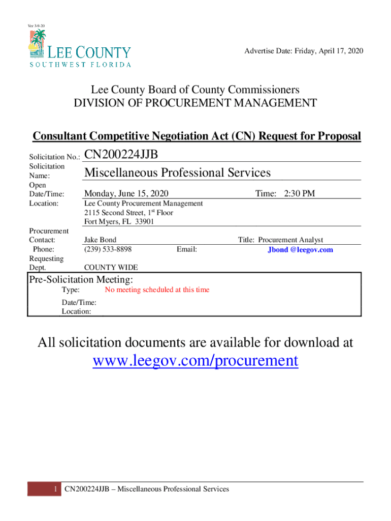 Very 3920Advertise Date: Friday, April 17, 2020Lee County Board of County Commissioners DIVISION OF PROCUREMENT MANAGEMENT Consultant Competitive Negotiation Act (CN) Request for ProposalCN200224JJB