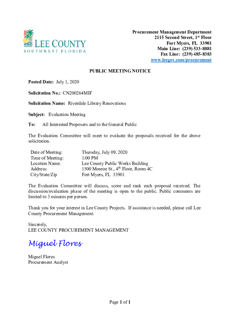Procurement Management Department 2115 Second Street, 1st Floor Fort Myers, FL 33901 Main Line: (239) 5338881 Fax Line: (239) 4858383 www.leegov.com/procurement PUBLIC MEETING NOTICE Posted Date:
