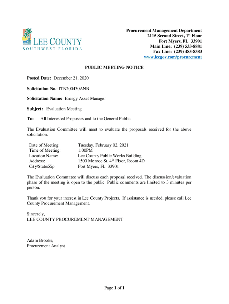 Procurement Management Department 2115 Second Street, 1st Floor Fort Myers, FL 33901 Main Line: (239) 5338881 Fax Line: (239) 4858383 www.leegov.com/procurement PUBLIC MEETING NOTICE Posted Date:
