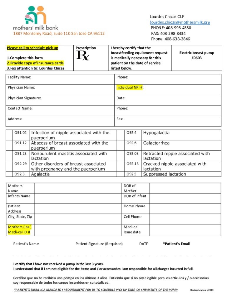 Lourdes Chicas CLE lourdes.chicas@mothersmilk.org PHONE: 4089984550 FAX: 4082988434 Phone: 40863828461887 Monterey Road, suite 110 San Jose CA 95112 Please call to schedule pick upPrescription1. Complete