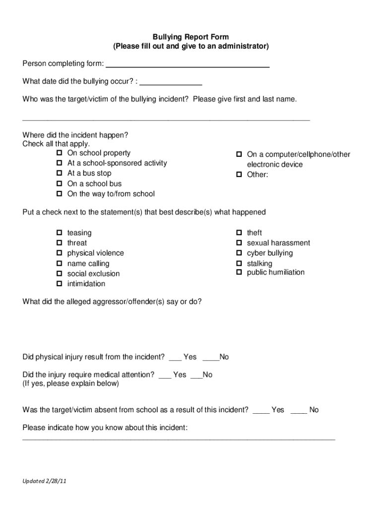 Get the free Bullying Report Form (Please fill out and give to an administrator ...