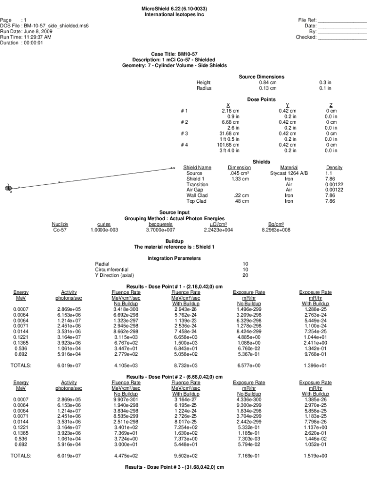 MicroShield 6.22 (6.100033) International Isotopes Inc Page :1 DOS File : BM1057_side_shielded.ms6 Run Date : June 8, 2009, Run Time: 11:29:37 AM Duration : 00:00:01File Ref: ___ Date: ___ By: ___