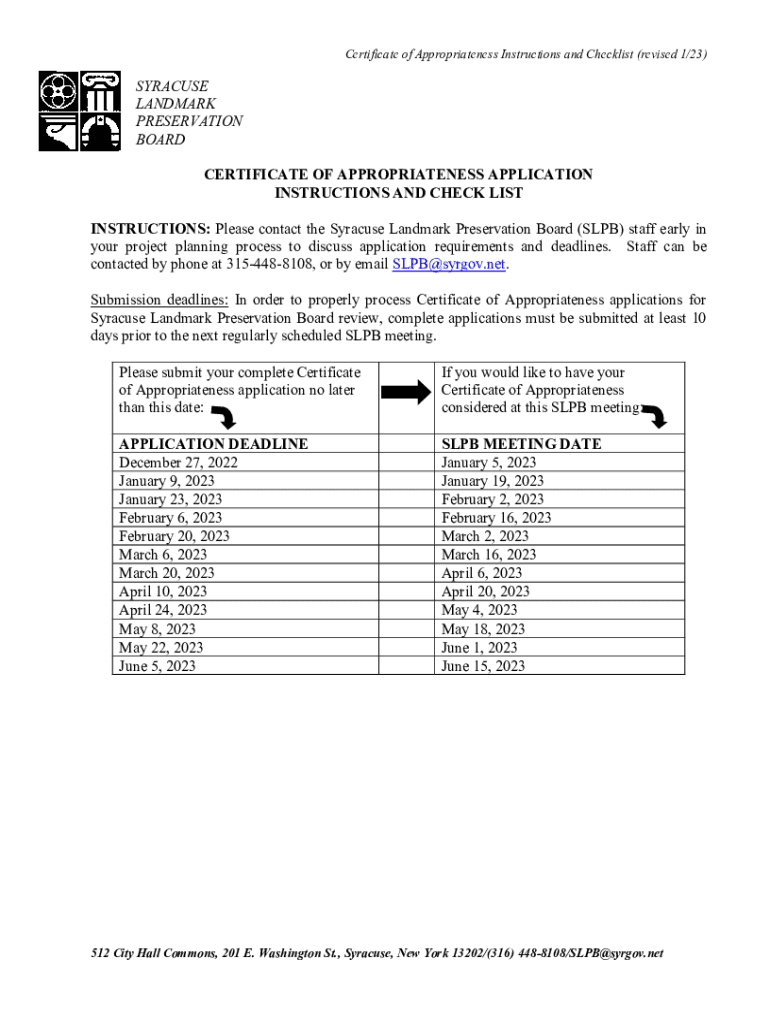 Certificate of Appropriateness Instructions and Checklist (revised 1/23)SYRACUSE LANDMARK PRESERVATION BOARD CERTIFICATE OF APPROPRIATENESS APPLICATION INSTRUCTIONS AND CHECK LIST INSTRUCTIONS: Please