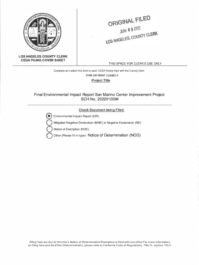 LOS ANGELES COUNTY CLERK CEA FILING COVER SHEETS SPACE FOR CLERK\'S USE Incomplete and attach this form to each CEA Notice filed with the County Clerk TYPE OR PRINT CLEARLYProject TitleFinal Environmental