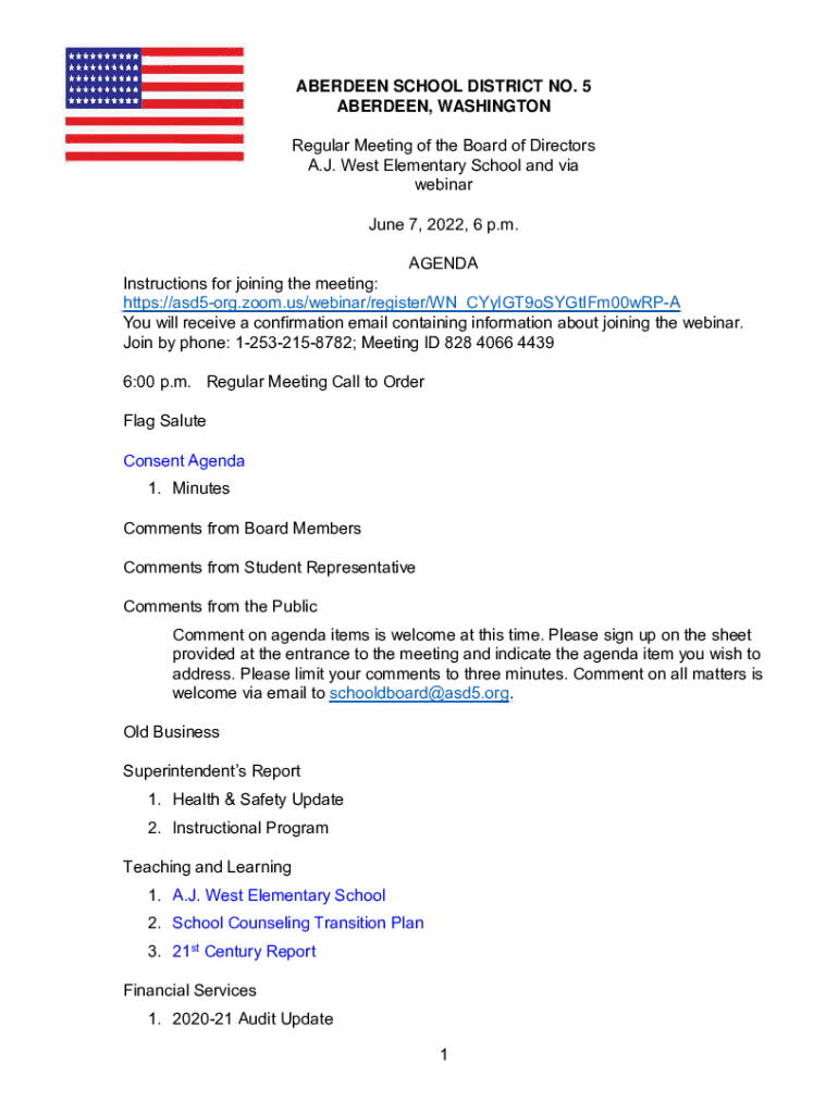 ********** ********** ********** ********** **********ABERDEEN SCHOOL DISTRICT NO. 5 ABERDEEN, WASHINGTON Regular Meeting of the Board of Directors A.J. West Elementary School and via webinar June