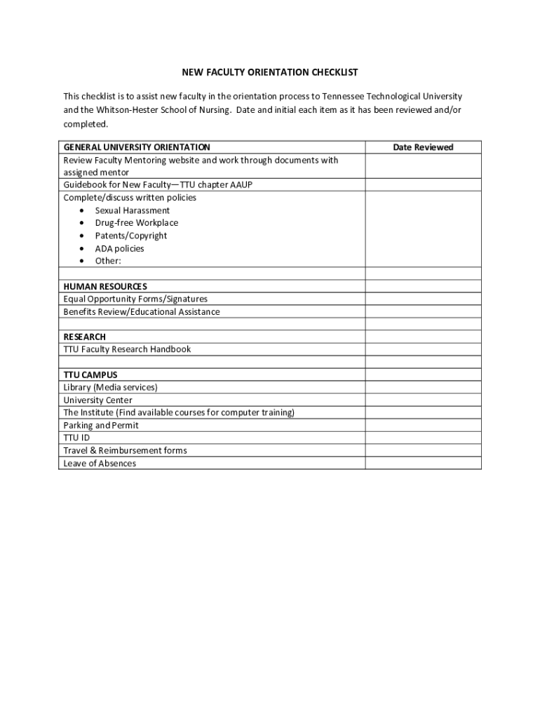 NEW FACULTY ORIENTATION CHECKLIST This checklist is to assist new faculty in the orientation process to Tennessee Technological University and the WhitsonHester School of Nursing. Date and initial