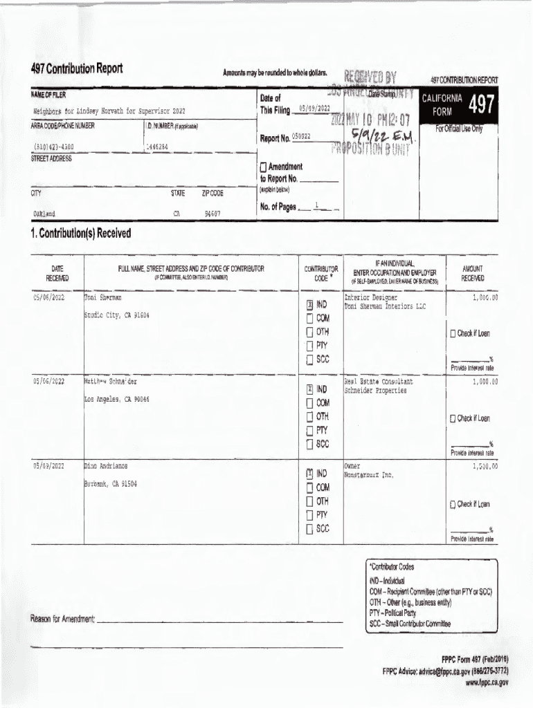 497 Contribution ReportAmounts may be rounded to whole dollars.NAME OF FILER497 CONTRIBUTION Reportage neighbors for Lindsey Format for Supervisor 2022 AREA CODE/PHONE Numbers Filing, \” fit Y I