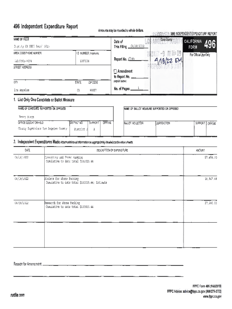 496 Independent Expenditure Report Seamounts may be rounded to whole dollars. OF Filtrate of This FilingDignity CA SEU Local 2015 AREA CODE/PHONE NUMBER. D. SUM BER(213) 985039404 / 10 / 2022(if app/cable)Report