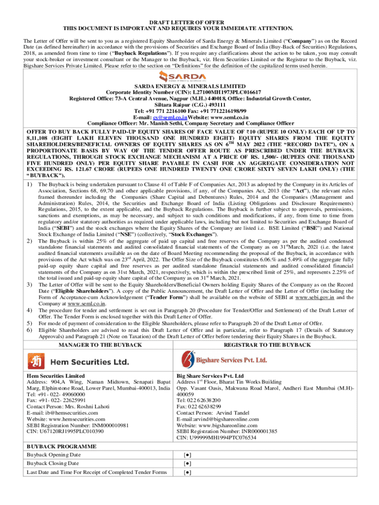 Get the free Draft Letter of Offer THIS DOCUMENT IS IMPORTANT ... - SEBI