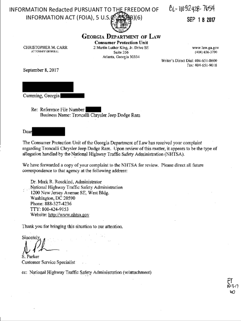 INFORMATION Redacted PURSUANT TO THE FREEDOM OF INFORMATION ACT (FOIA), 5 U.S.C. 552(B)(6)El H00242Br 705q SEP 1 8 2017GEORGIA DEPARTMENT OF LAW Consumer Protection Unit CHRISTOPHER M. CARR ATTORNEY