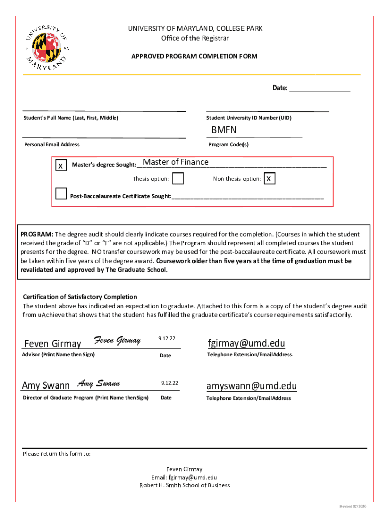 UNIVERSITYOFMARYLAND, COLLEGEPARK OfficeoftheRegistrar APPROVED PROGRAM COMPLETIONFORMDate:Student\'s Filename(Last, First, Middle)StudentUniversityIDNumber(UID)BCFN Program Code(s)Personal EmailAddressxMaster