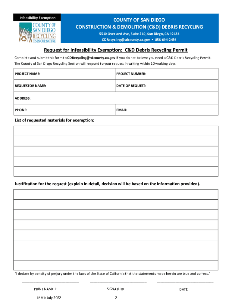 In feasibility ExemptionCOUNTY OF SAN DIEGO CONSTRUCTION & DEMOLITION (C&D) DEBRIS RECYCLING 5510 Overland Ave, Suite 210, San Diego, CA 92123 CDRecycling@sdcounty.ca.gov 8586942456Diversion Requirements: