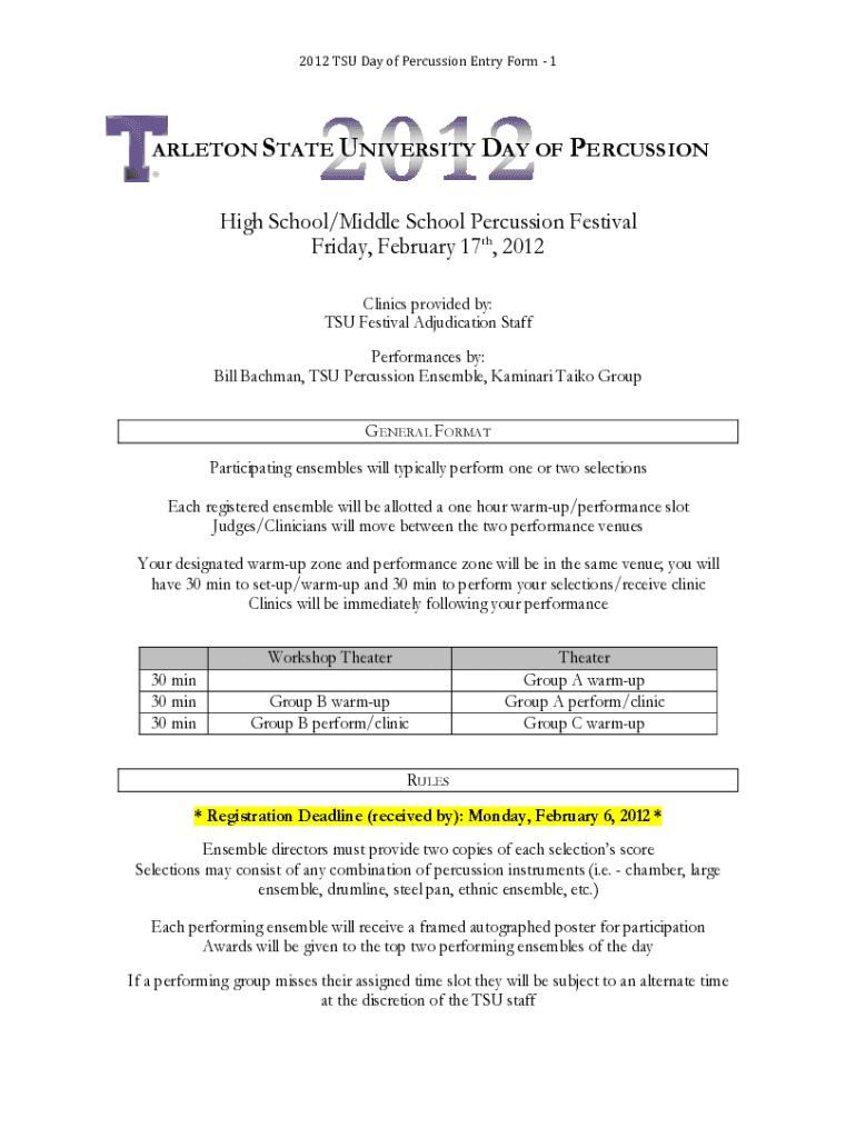 2012TSUDayofPercussionEntryForm1ARLETON STATE UNIVERSITY DAY OF Percussionist School/Middle School Percussion Festival Friday, February 17th, 2012 Clinics provided by: CSU Festival Adjudication Staff