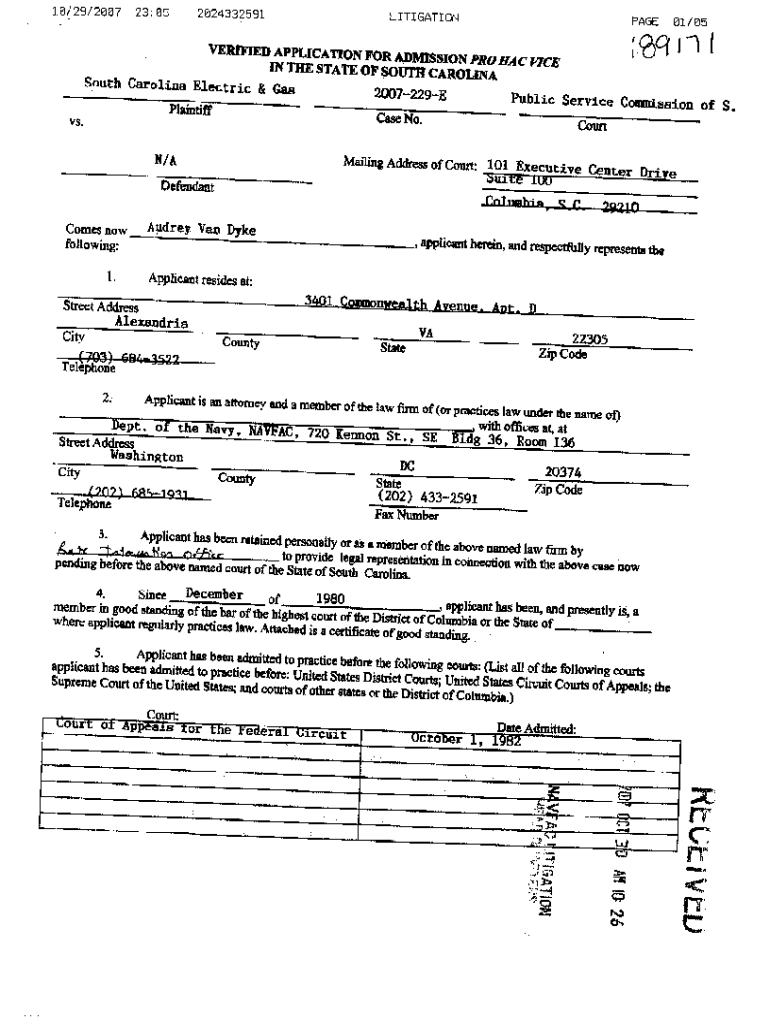 1.0/29/200723:052024332591.81 I 85-PAGE PAGE 01/05LITIGATION LITIGATION282433259123: 8518/29/2887[P)verified APPLICATION FOR ADMISSION PRO HAC V?CE IN THE STATE SOUTH THE STATEHOOD SOUTHCAROLINA CAROLINASouth