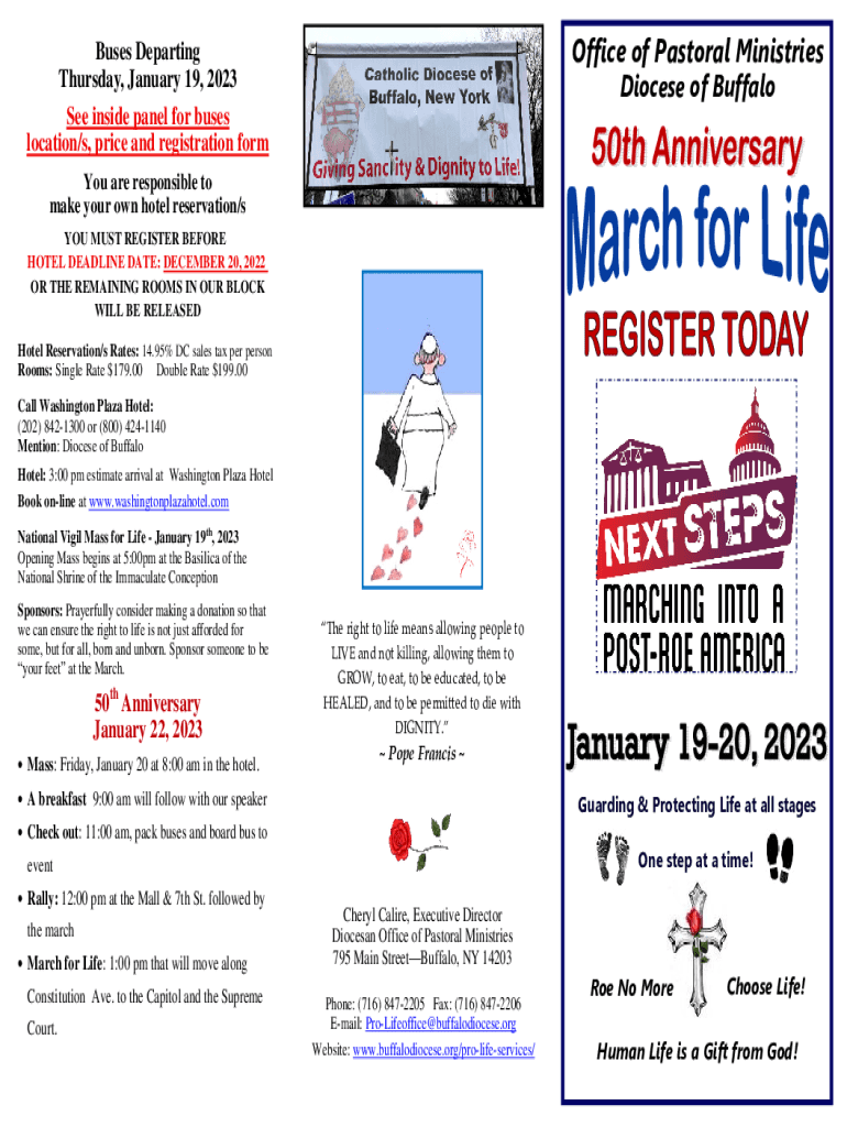 Office of Pastoral MinistriesBuses Departing Thursday, January 19, 2023, See inside panel for buses location/s, price and registration formDiocese of Buffalo are responsible to make your own hotel