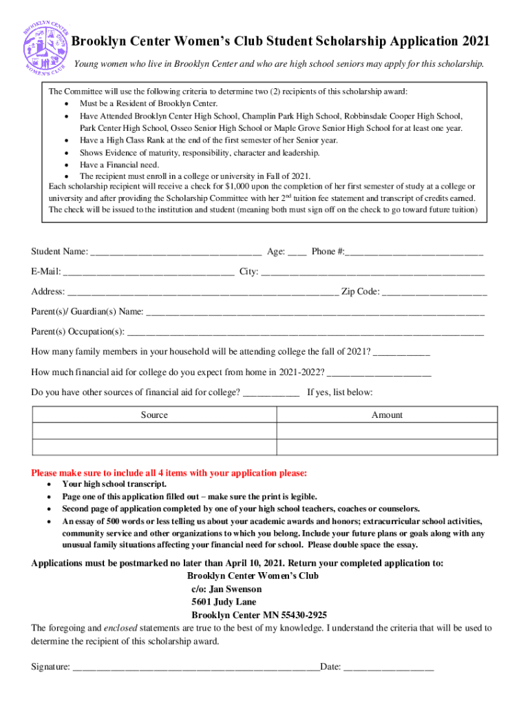 Get the free Brooklyn Center Women's Club Student Scholarship ...
