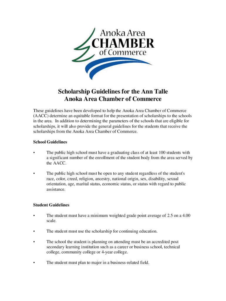 Scholarship Guidelines for the Ann Table ANOVA Area Chamber of Commerce These guidelines have been developed to help the ANOVA Area Chamber of Commerce (AAC) determine an equitable format for the