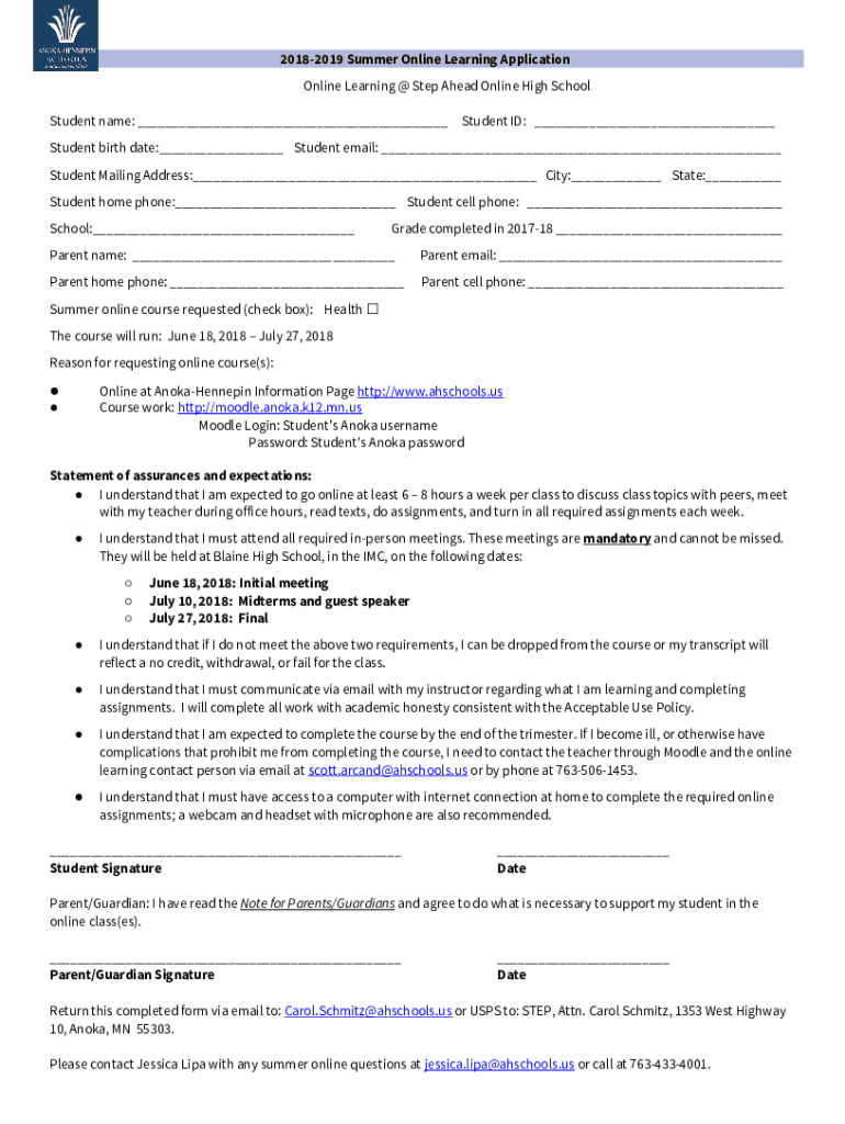 20182019 Summer Online Learning Application Online Learning @ Step Ahead Online High School Student name: ___Student ID: ___Student birthdate:___ Student email: ___ Student Mailing Address:___ City:___