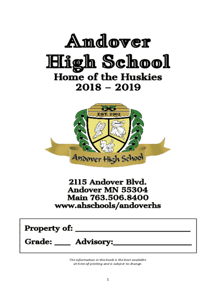 Andover High School Home of the Huskies 2018 2019 2115 Andover Blvd. Andover MN 55304 Main 763.506.8400 www.ahschools/andoverhs Property of: ___ Grade: ___ Advisory:___ The information in this book