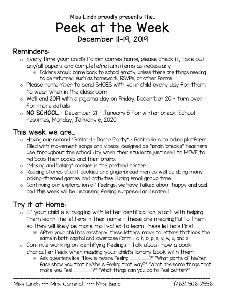 Miss Linda proudly presents tepee at the Week December 1119, 2019Reminders: o Every time your children folder comes home, please check it, take out any/all papers and complete/return items as necessary.