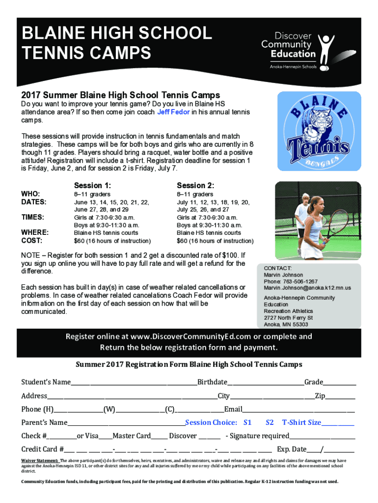 BLAINE HIGH SCHOOL TENNIS CAMPS 2017 Summer Blaine High School Tennis Camps you want to improve your tennis game? Do you live in Blaine HS attendance area? If so then come join coach Jeff Fedora in