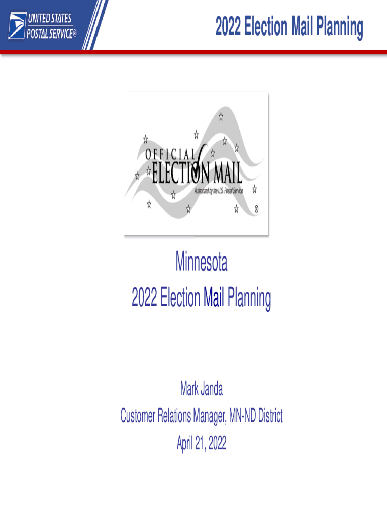 2022 Election Mail Planning Minnesota 2022 Election Mail Planning Mark Wanda Customer Relations Manager, MIND District April 21, 20222022 Election Mail PlanningAgenda Brief Introductions Postal Service