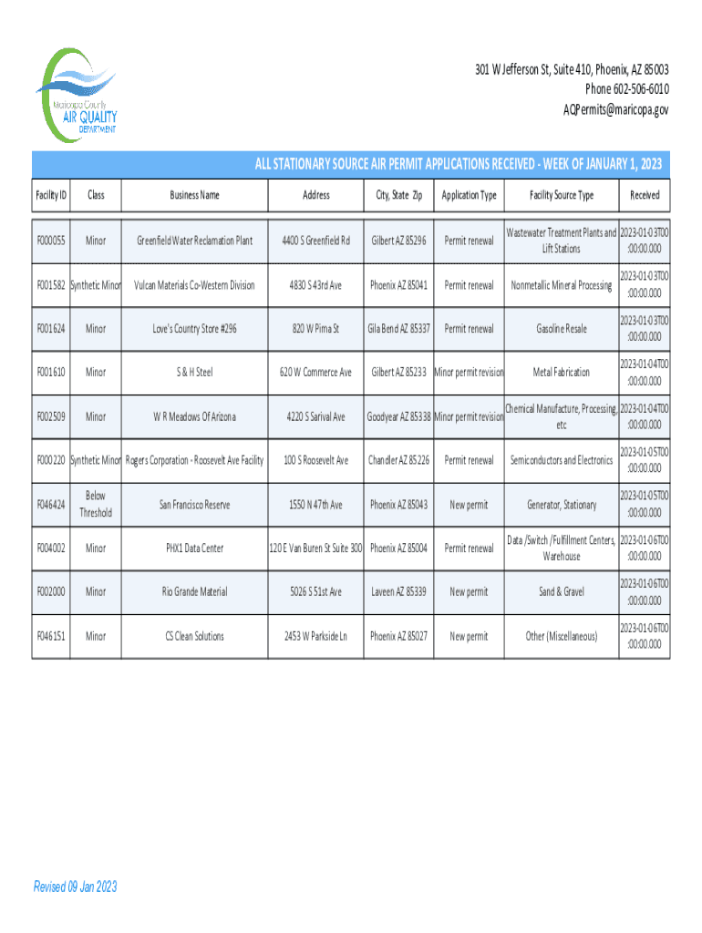 AQPermits@maricopa.govALL STATIONARY SOURCE AIR PERMIT APPLICATIONS RECEIVED WEEK OF JANUARY 1, 2023,