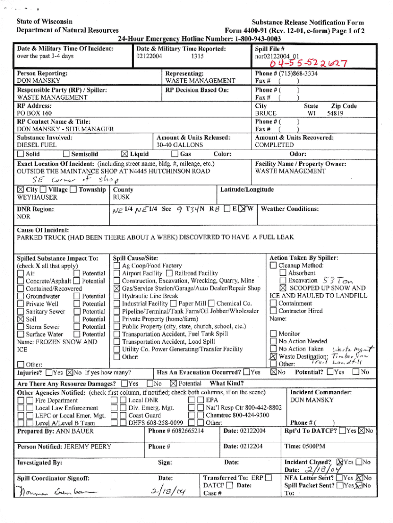 State of Wisconsin Substance Release Notification Form Department of Natural Resources Form 440091 (Rev. 1201, form) Page 1 of2 24H our Emergency H tome r N urn BER: 18009430003 Date & Military Time