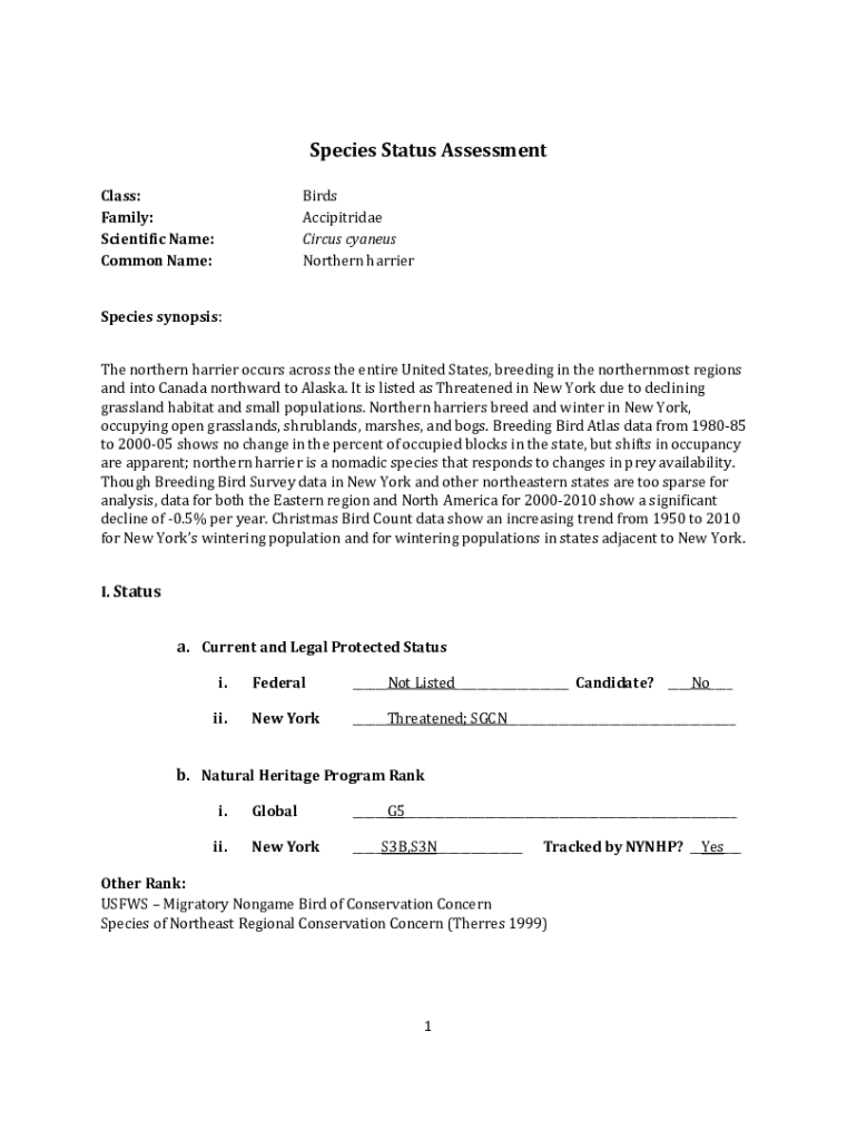 Species Status Assessment Class: Family: Scientific Name: Common Name:Birds Accipitridae Circus cranes Northern harrierSpecies synopsis: The northern harrier occurs across the entire United States,