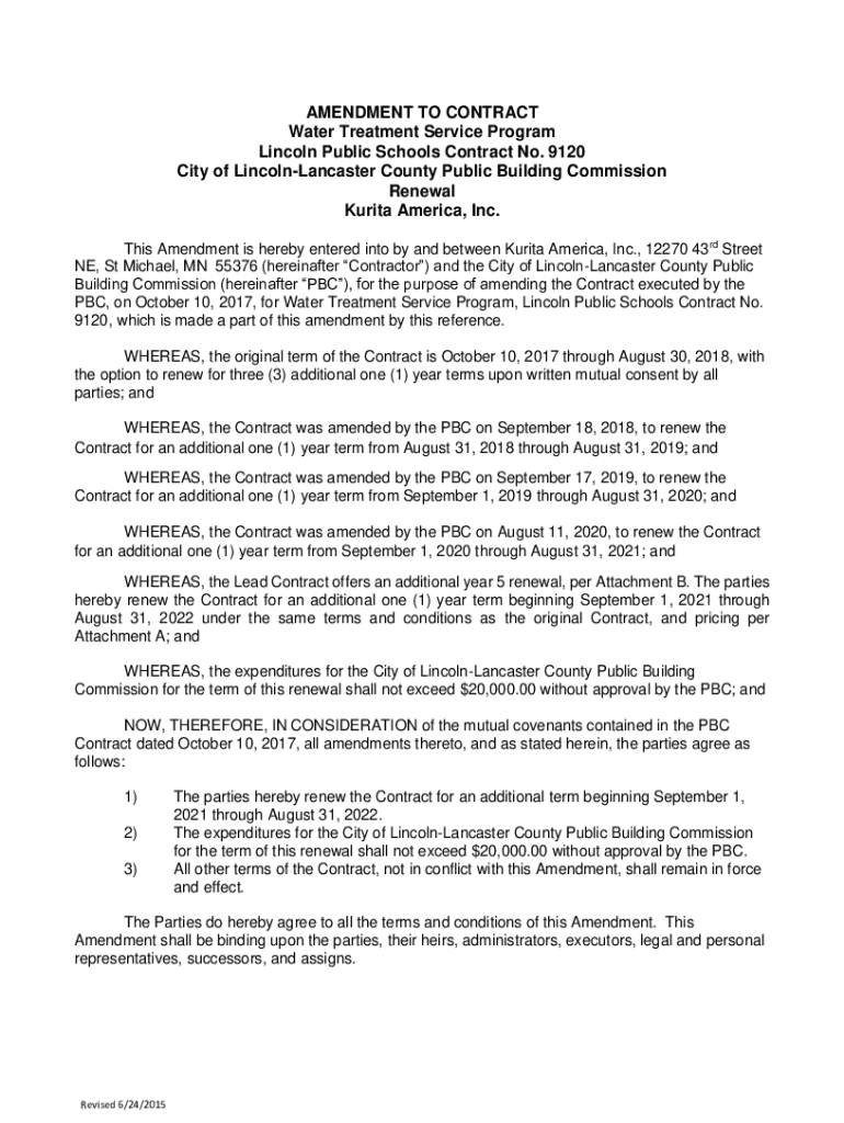 AMENDMENT TO CONTRACT Water Treatment Service Program Lincoln Public Schools Contract No. 9120 City of Lincoln Lancaster County Public Building Commission Renewal Kurt America, Inc. This Amendment