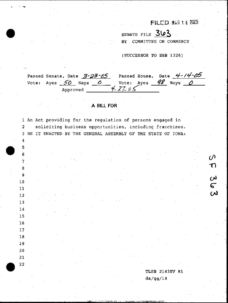 Filed MAR 14 2005SENATE FILE BY3. J) COMMITTEE ON COMMERCE(SUCCESSOR TO SSB 1226)Passed Senate, Date ;?a6 Passed House, Vote: Ayes 50 Nays 6 Vote: Ayes Approved _ _ ___;TF__:l_?.\'0_\'S___Date91\'145