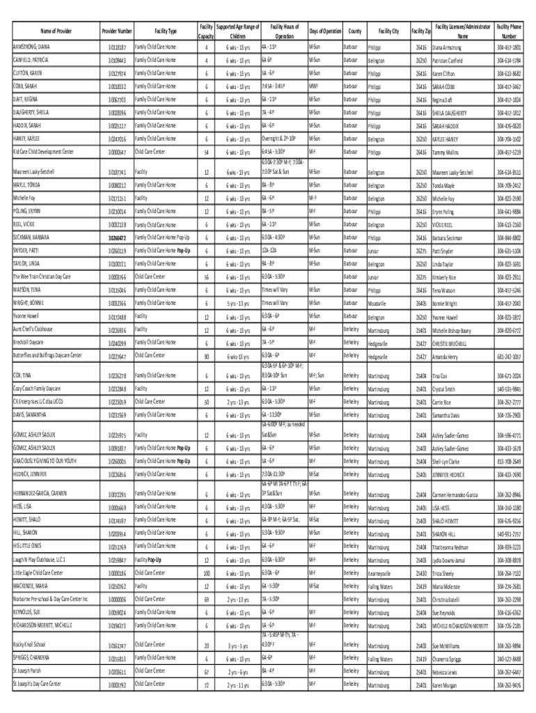 ARMSTRONG, DIANA30118187Family Child Care Home46 was 13 facility Hours of Operation 4A 11PMSunBarbourPhilippi26416Diana Armstrong3044571801CANFIELD, PATRICIA30109443Family Child Care Home46 was 13