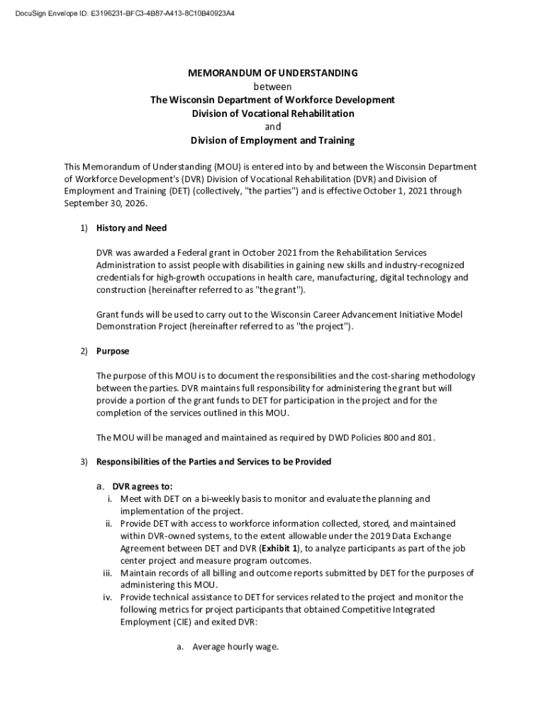 DocuSign Envelope ID: E3196231BFC34B87A4138C10B40923A4MEMORANDUM OF UNDERSTANDING between The Wisconsin Department of Workforce Development Division of Vocational Rehabilitation and Division of Employment