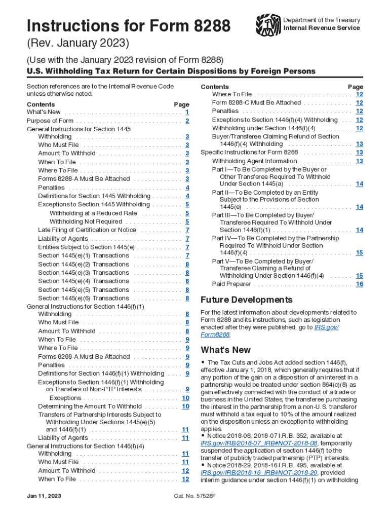 Instructions for Form 8288Department of the Treasury Internal Revenue Service(Rev. January 2023)(Use with the January 2023 revision of Form 8288) U.S. Withholding Tax Return for Certain Dispositions