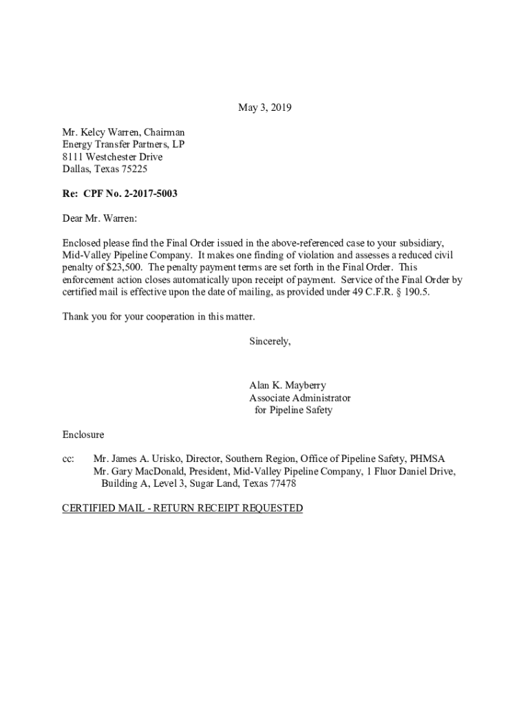 May 3, 2019, Mr. Kelly Warren, Chairman Energy Transfer Partners, LP 8111 Westchester Drive Dallas, Texas 75225 Re: CPF No. 220175003 Dear Mr. Warren: Enclosed please find the Final Order issued in