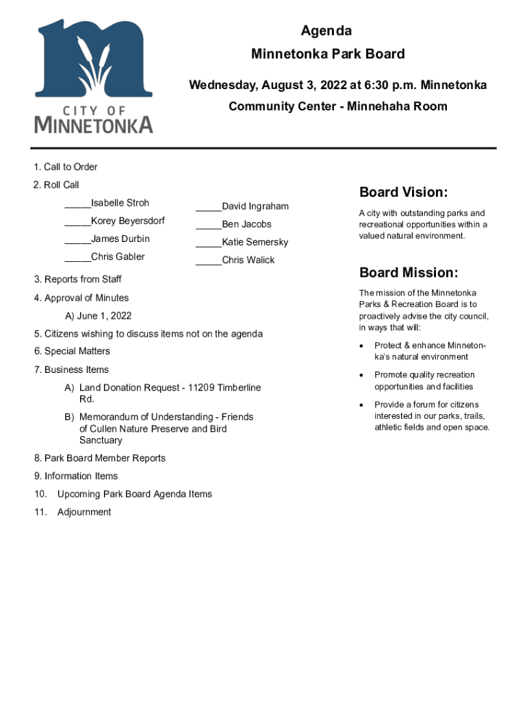 Agenda Minnetonka Park Board Wednesday, August 3, 2023 at 6:30 p.m. Minnetonka Community Center Minnesota Room1. Call to Order 2. Roll Wallboard Vision:___Isabelle Stroh___David Ingraham___Korey Beyersdorf___Ben