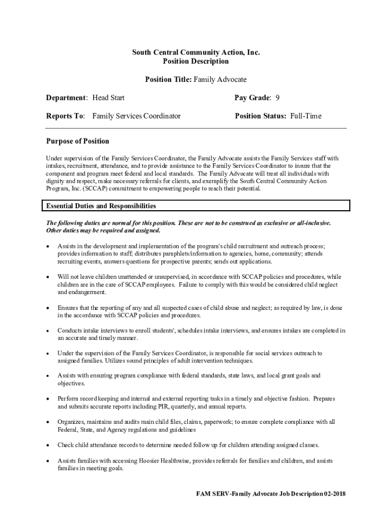 South Central Community Action, Inc. Position Description Position Title: Family Advocate Department: Head Started Grade: 9Reports To: Family Services CoordinatorPosition Status: FullTimePurpose of