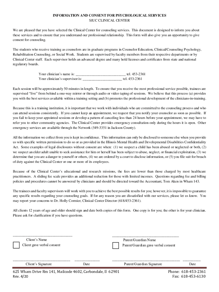 Get the free Informed Consent for Therapy Services - Adult - clinicalcenter siu