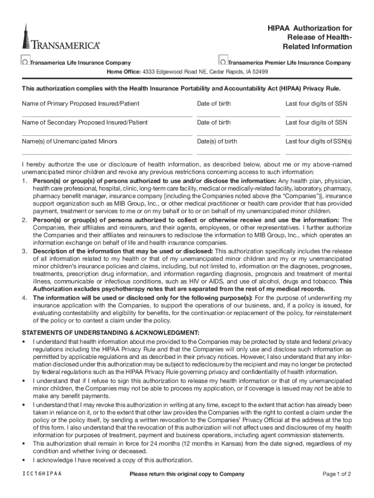 HIPAA Authorization for Release of HealthRelated Information Transamerica Life Insurance Company Transamerica Premier Life Insurance CompanyHome Office: 4333 Edgewood Road NE, Cedar Rapids, IA 52499This