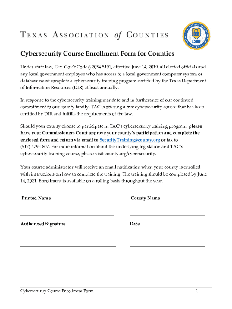 Cybersecurity Course Enrollment Form for Counties Under state law, Tex. Govt Code 2054.5191, effective June 14, 2019, all elected officials and any local government employee who has access to a local