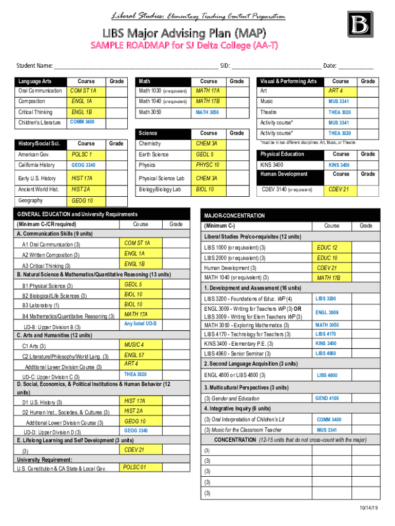 Liberal Studies: Elementary Teaching Content PreparationBLIBS Major Advising Plan (MAP)SAMPLE ROADMAP for SJ Delta College (AAT)Student Name: ___ SID: ___ Date: ___ Language ArtsCourseGradeMathCourseGradeVisual