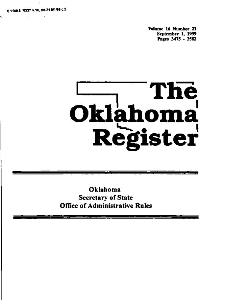 S 1100.6 R337 v.16, no.21 9/1/99 c.2Volume 16 Number 21 September 1, 1999, Pages 3475 3582I,Oklahoma Register Oklahoma Secretary of State Office of Administrative Rules Frank Keating, Governor Mike