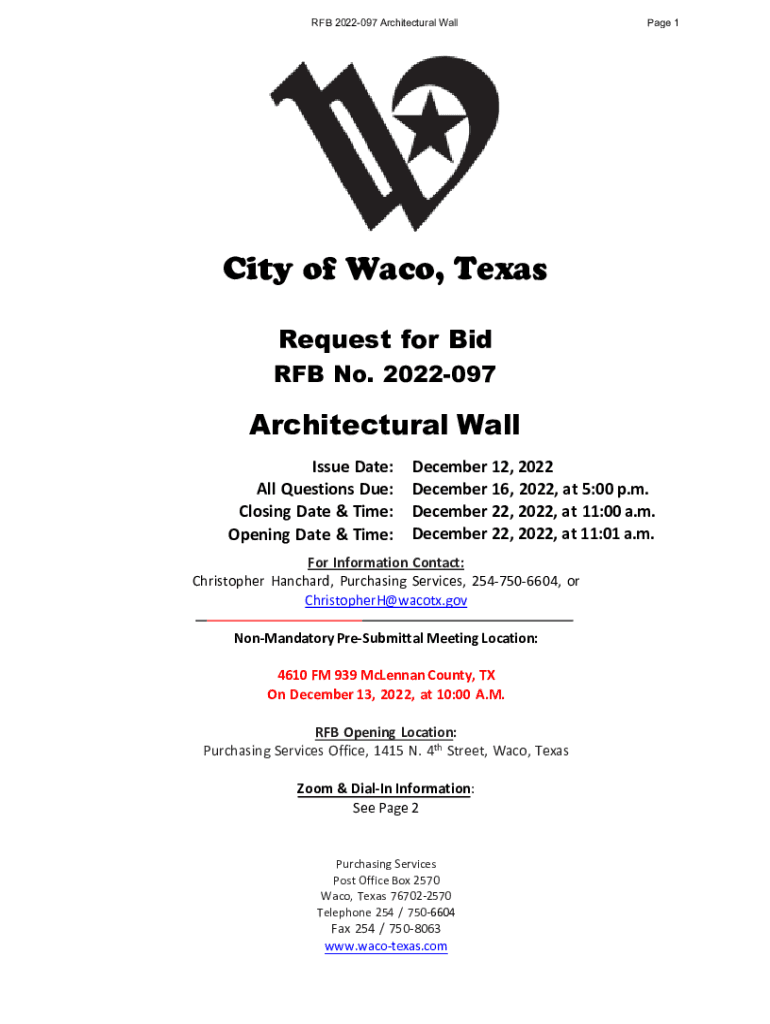 ROB 2022097 Architectural Wall Page 1City of Waco, Texas Request for Bid ROB No. 2022097Architectural Wall Issue Date: All Questions Due: Closing Date & Time: Opening Date & Time:December 12, 2022,