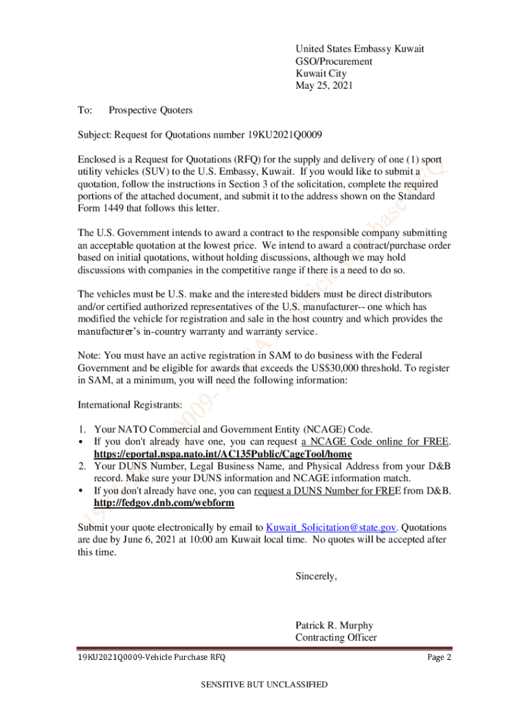 United States Embassy Kuwait GSO/Procurement Kuwait City May 25, 2021, To:Prospective QuotersSubject: Request for Quotations number 19KU2021Q0009 Enclosed is a Request for Quotations (RFQ) for the