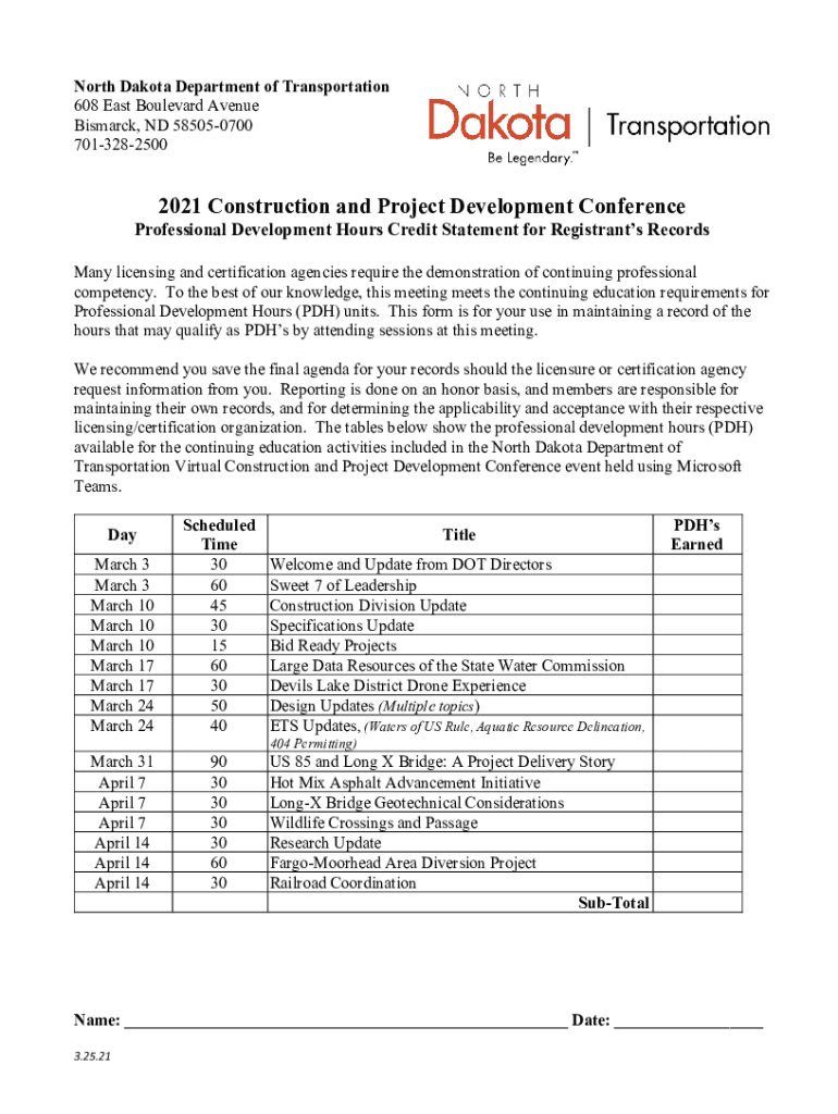 North Dakota Department of Transportation 608 East Boulevard Avenue Bismarck, ND 585050700 70132825002021 Construction and Project Development ConferenceProfessional Development Hours Credit Statement