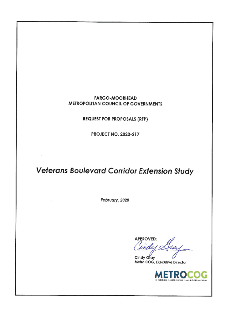 REQUEST FOR PROPOSALS (RFP) The FargoMoorhead Metropolitan Council of Governments (Metro COG) requests proposals from qualified consultants for the following project: Veterans Boulevard Corridor Extension